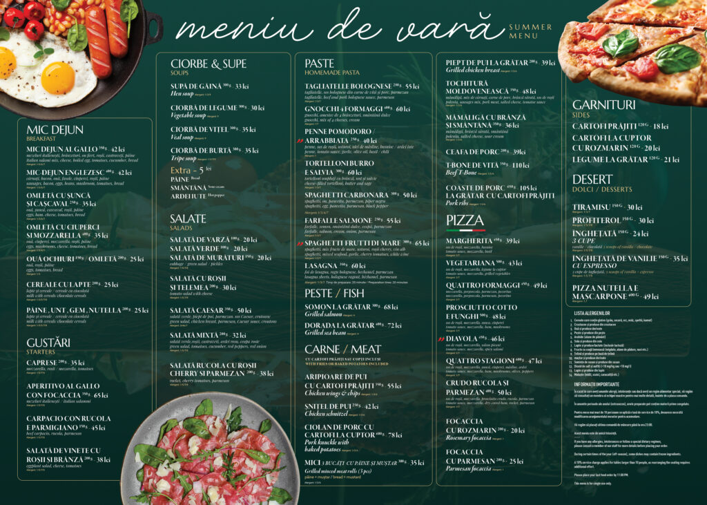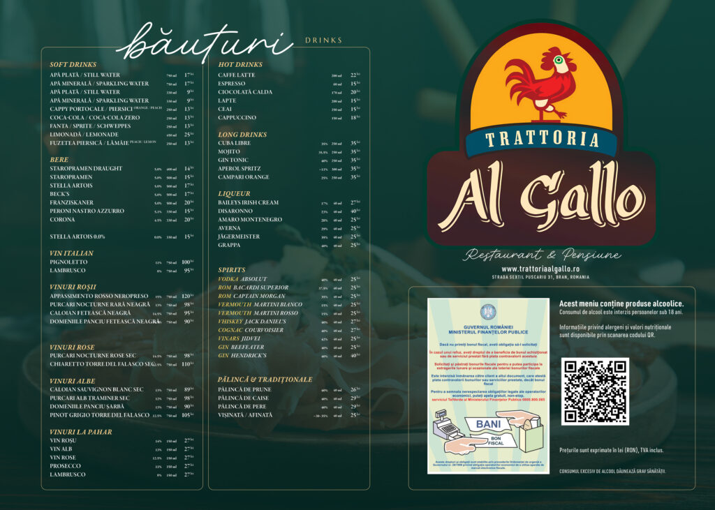 La Trattoria Al Gallo, fiecare fel de mâncare este o călătorie culinară care imbina perfect gustul bucatariei Italiene cu cel al bucatariei romanesti. Folosim doar ingrediente proaspete și de calitate pentru a vă oferi cele mai savuroase preparate tradiționale .. De la aperitive delicioase la deserturi rafinate, meniul nostru diversificat este creat pentru a satisface toate gusturile.